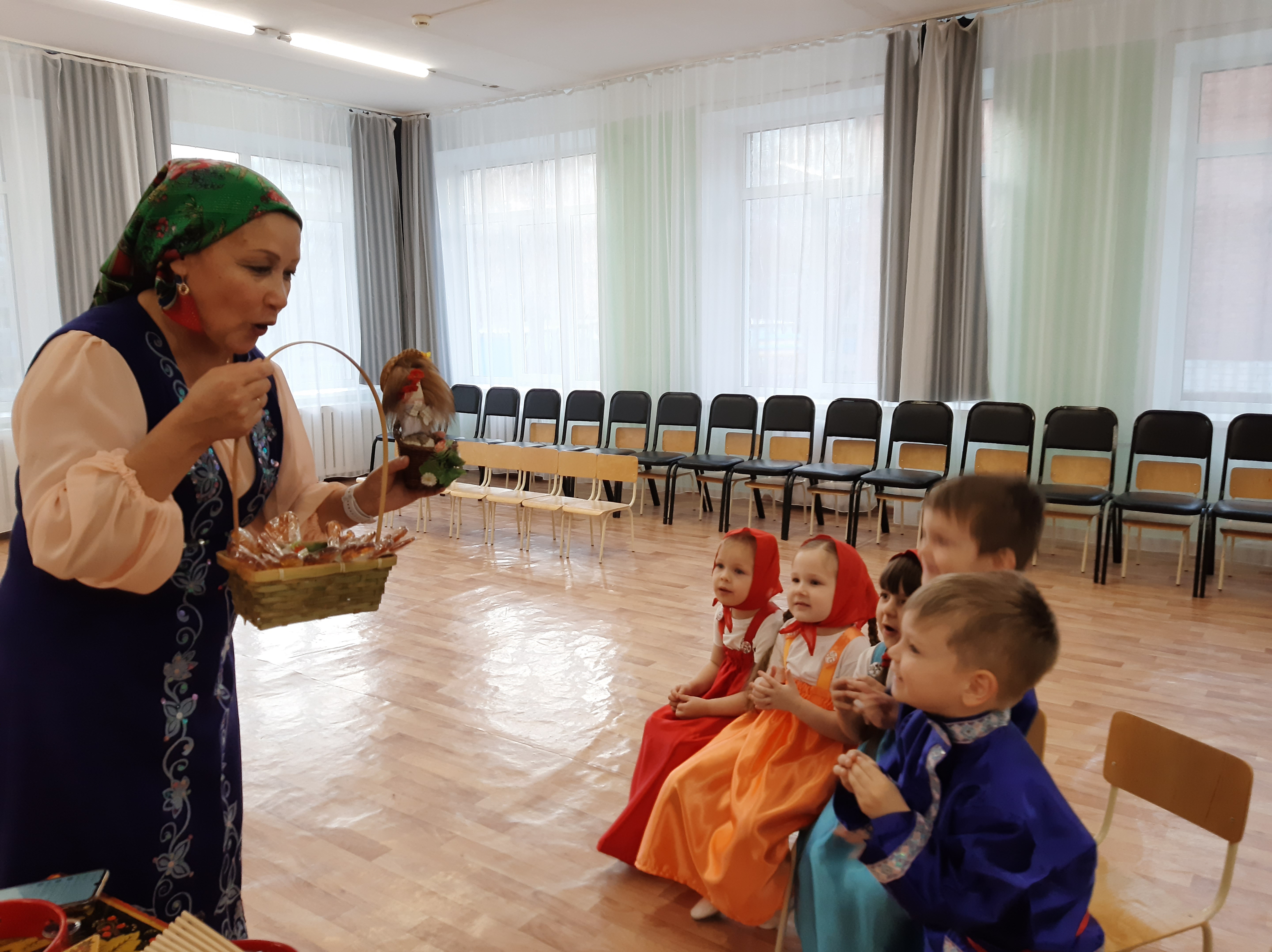 В нашей группе мы начли знакомство с бытом русского народа. Ребята ходили в гости к Хозяюшки, где смогли увидеть, как раньше жили наши бабушки и дедушки. Дети познакомились с элементами народного быта, предметами домашнего обихода (чугунок, ухват), читали наизусть небольшие потешки.